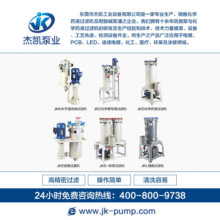 東莞市杰凱工業(yè)設(shè)備有限公司是一家專業(yè)生產(chǎn),銷售化學(xué)藥液過濾機(jī)及耐酸堿泵浦等產(chǎn)品廠家.公司擁有十余年防腐泵與化學(xué)藥液過濾機(jī)的研發(fā)及生產(chǎn)經(jīng)驗(yàn)和技術(shù),技術(shù)力量雄厚,設(shè)備,工藝先進(jìn),檢測設(shè)備齊全.所生產(chǎn)之產(chǎn)品廣泛應(yīng)用于電鍍,PCB,LED,連續(xù)電鍍,化工,醫(yī)療,環(huán)保及涂裝等領(lǐng)域.